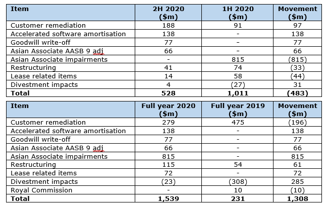 The following tables are provided to illustrate the impacts of the above items to cash continuing profit after tax (versus prior comparable periods):