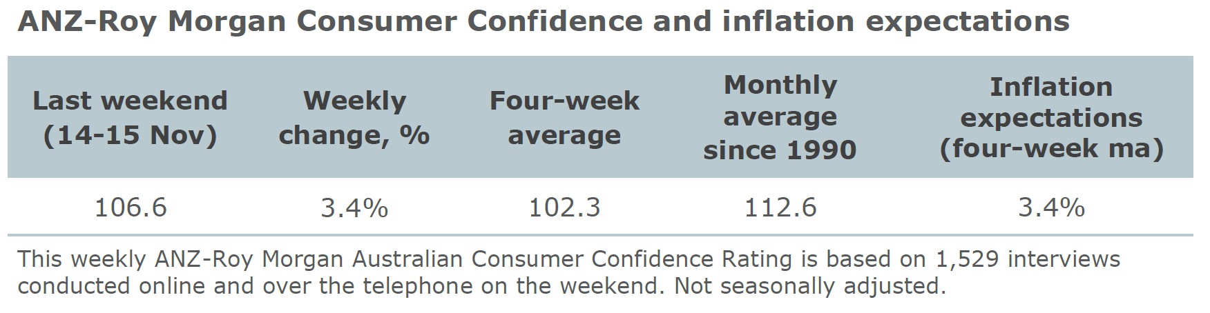 ‘Time to buy a major household item’ softened marginally by 0.2 per cent. This small fall does come after a rise of 10 per cent in the prior week. The four-week moving average of ‘inflation expectations’ remained stable at 3.4 per cent.
