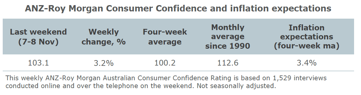 ‘Time to buy a major household item’ jumped by 10 per cent to its highest level since early March. The four-week moving average of ‘inflation expectations’ remained stable at 3.4 per cent.