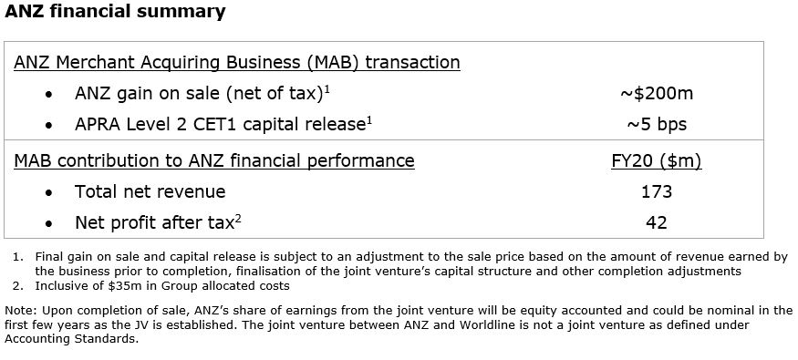 ANZ estimates completion of the transaction will increase its Level 2 CET1 capital ratio by ~5 basis points1. The transaction is expected to be completed in late 2021 and is subject to regulatory and other approvals and card scheme arrangements.