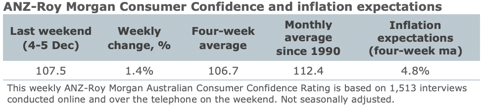 "Consumer confidence rose 1.4 per cent last week even as ‘weekly inflation expectations’ rose a touch to 4.9 per cent." ANZ Head of Australian Economics, David Plank said.