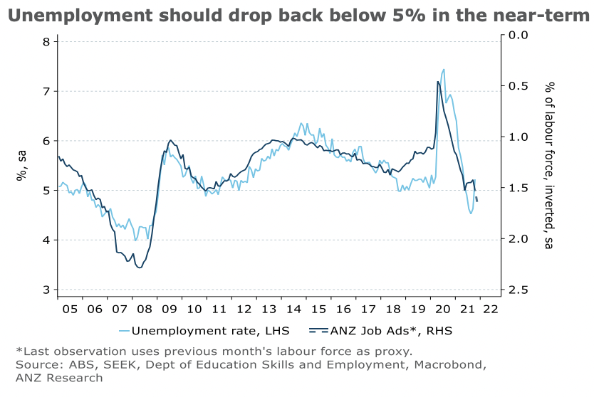 "ANZ Job Ads suggests the unemployment rate should drop back below 5 per cent in the near term, and we expect it to fall to around 4 per cent by the end of 2022 and even further in 2023."