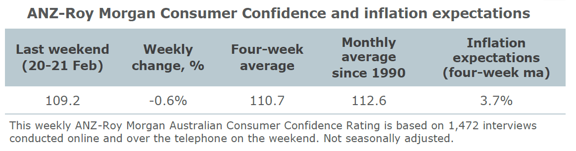 Consumer confidence fell 0.6 per cent last week, even as Victoria emerged from its brief circuit-breaker lockdown. The details were mixed - confidence around economic conditions improved, but weakened around financial conditions and time to buy household items.