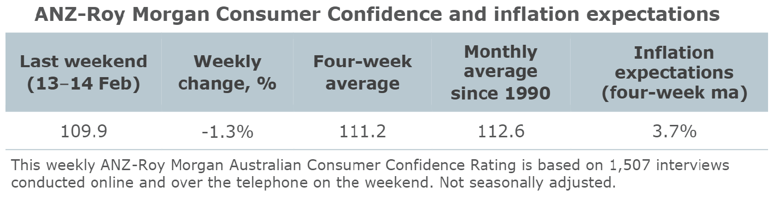 Consumer confidence dropped 1.3 per cent over the weekend of February 13 and 14, but remains near its long-run average. The assessment deteriorated on all subindices, except ‘current financial conditions’.