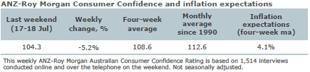 Consumer confidence dropped 5.2 per cent last week, its sharpest weekly fall since late March 2020. The fall follows the extension and tightening of the Sydney lockdown and the fifth lockdown in Melbourne. While the decline was sharp, confidence is still well above the levels seen through the first phase of the pandemic in 2020.