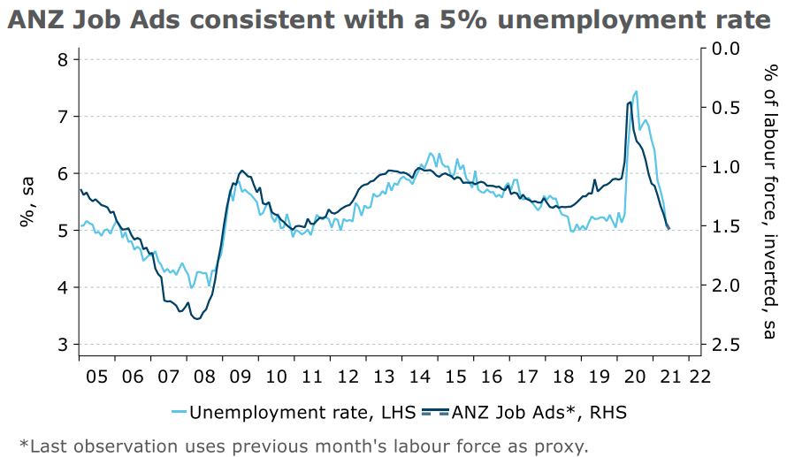 The remarkable 115k rise in employment in May saw the unemployment rate drop to its pre-pandemic rate of 5.1%, in line with the signal from ANZ Job Ads. The 3.0% m/m rise in ANZ Job Ads in June suggests there is more improvement to come in the near term, despite lockdowns.