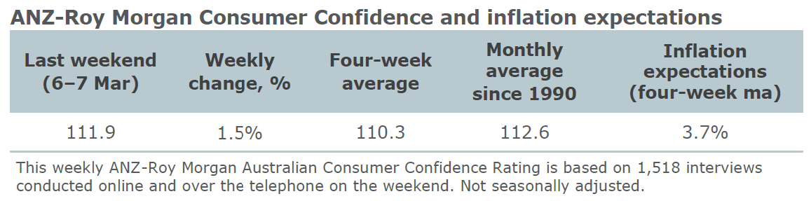 "The ANZ Roy-Morgan Consumer Confidence index rose 1.5 per cent along with generous gains in four out of five of the sub-indices," ANZ Head of Australian Economics David Plank said. "The rise likely reflects the strong gains registered by ANZ Job Ads and the GDP numbers released last week."
