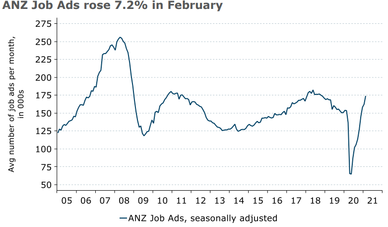 ANZ Job Ads growth accelerated out of the summer holidays, despite 5-day lockdowns in Western Australia and Victoria during February. Job Ads is now 13.4% above its pre-pandemic level, equivalent to an additional 20,500 jobs