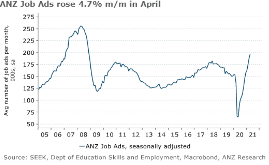 ANZ Australian Job Ads rose 4.7% m/m in April, its 11th straight monthly gain, signalling strong labour demand growth has continued post-JobKeeper. Job Ads is now up 27.8% on its pre-pandemic level.