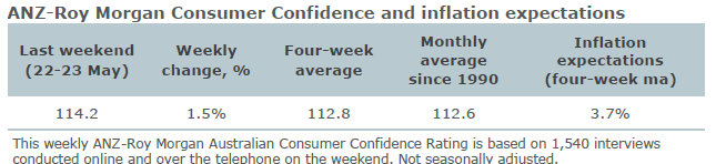 ‘Time to buy a major household item’ declined 0.7 per cent. ‘Weekly inflation expectations’ increased by 0.1ppt to 3.7 per cent, keeping the four-week moving average steady at 3.7 per cent.
