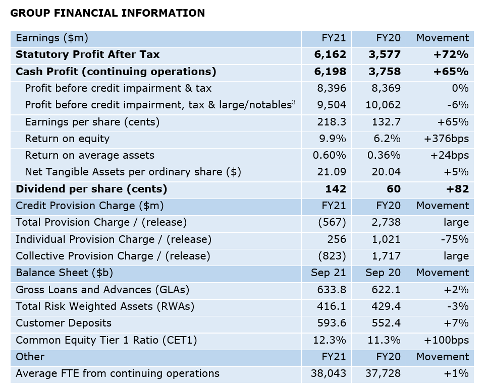 ANZ today announced an audited[1] Statutory Profit after tax for the year ended 30 September 2021 of $6,162 million, up 72% on the prior year with a key driver being the partial reversal of COVID-19 related credit provisions.