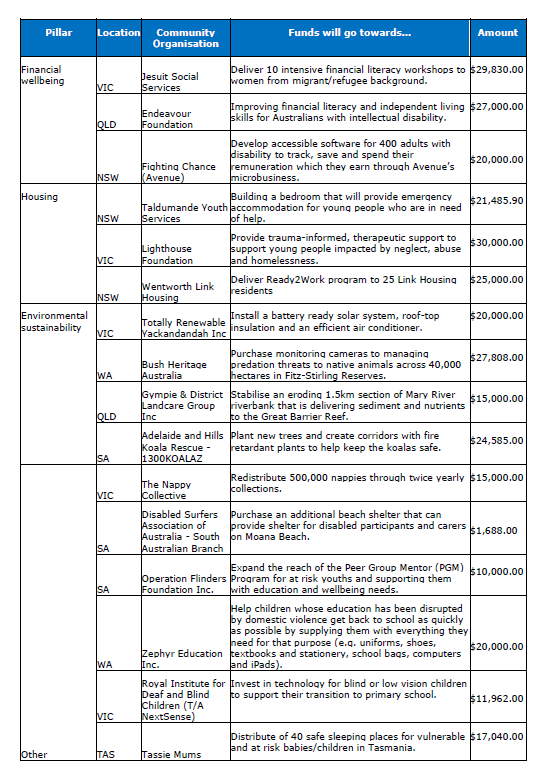 “It’s so great to see our ANZ people continuing to contribute some of their pay each week to help fund these vital projects and make a difference to the lives of many Australians in the process,” Ms Stubbings said.
