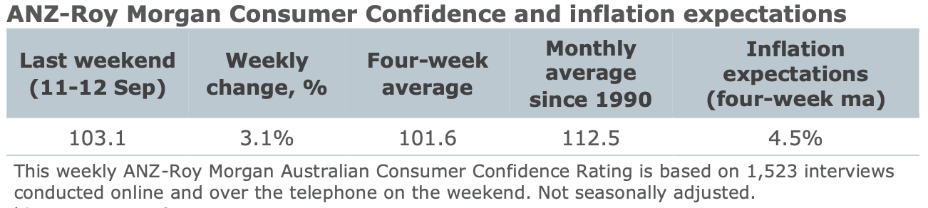 "Consumer confidence gained 3.1 per cent last week, driven by a huge jump of 10.6 per cent in Sydney as the NSW government released its roadmap out of lockdown. With close to 47 per cent of NSW’s adult population already fully vaccinated, this roadmap is expected to take effect by mid-October. That is, once the number reaches 70 per cent." ANZ Head of Australian Economics, David Plank said.