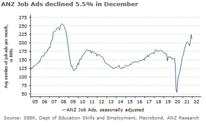 ANZ Australian Job Ads1 fell 5.5% m/m in December following an upwardly revised 17.2% jump over the previous two months as Delta lockdowns eased.
