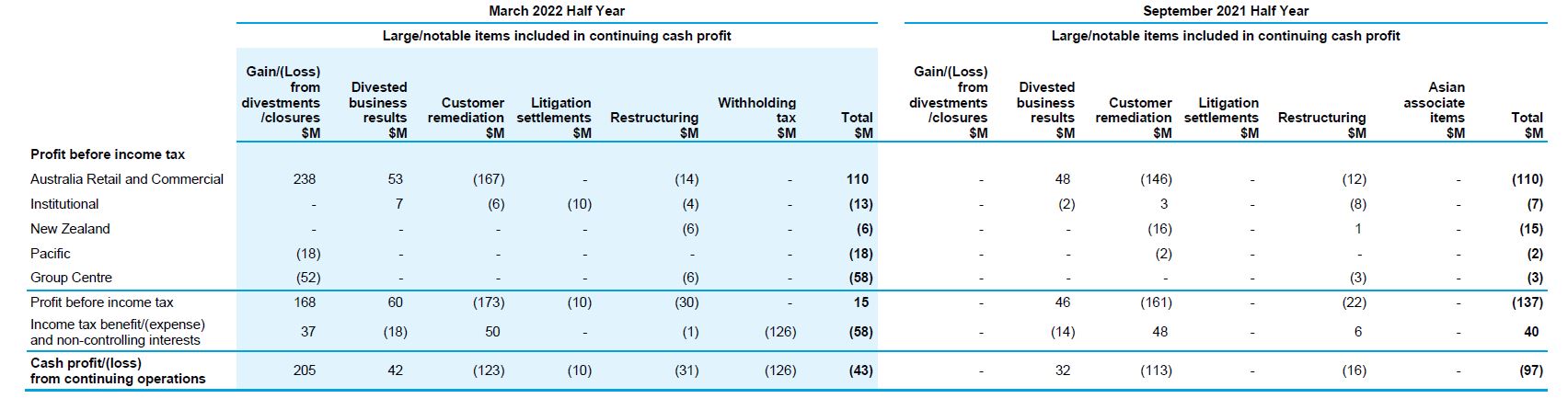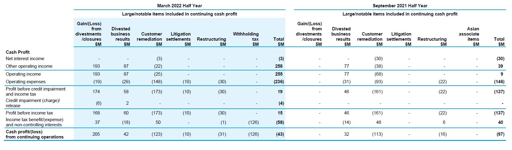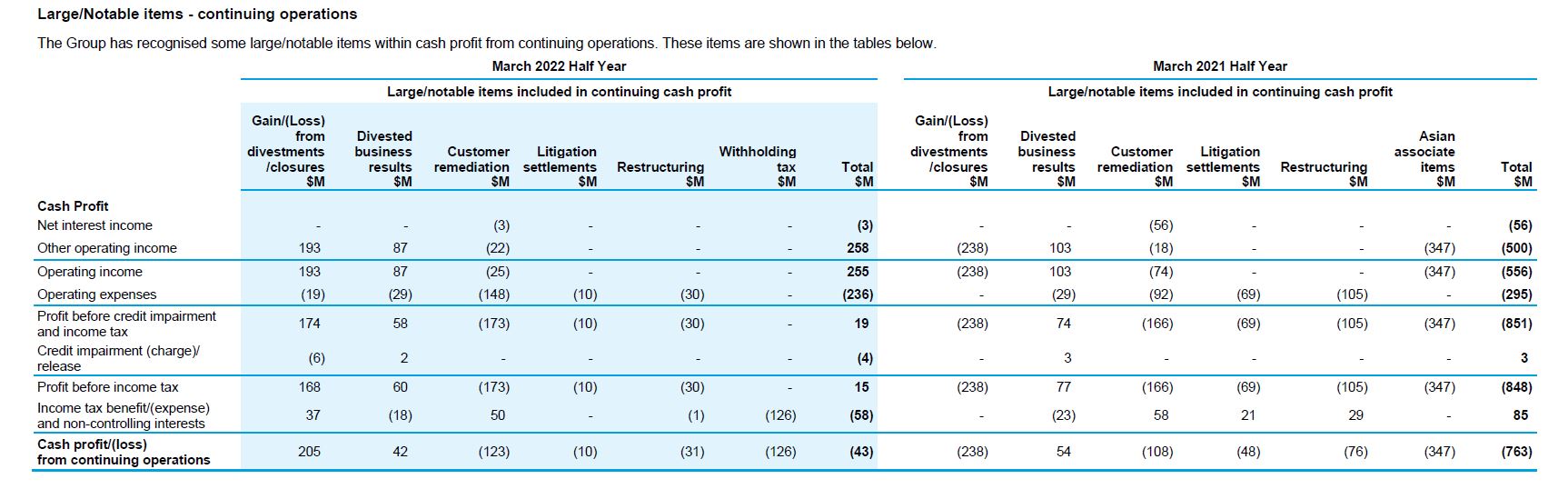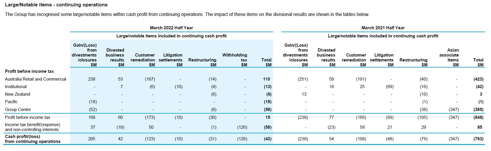 The relevant large/notable items (continuing operations) templates, reflecting the tables that will be shown in ANZ’s First Half 2022 Consolidated Financial Report & Dividend Announcement, are included on the following pages.