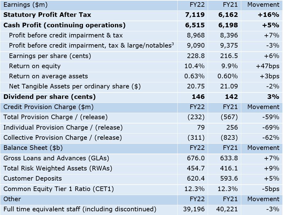 ANZ today announced an audited[1] Statutory Profit after tax for the full year ended 30 September 2022 of $7,119 million, up 16% on the previous year.