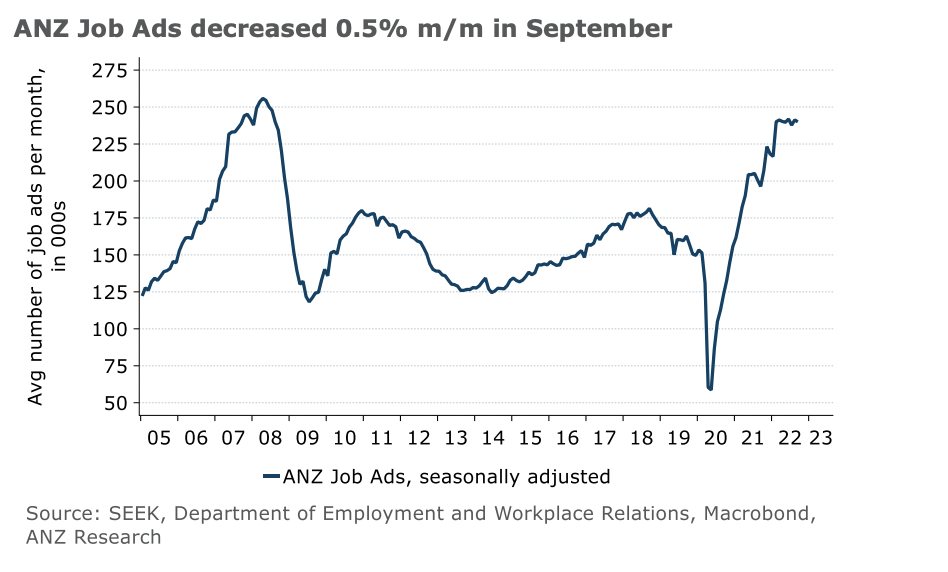 "ANZ Job Ads declined 0.5 per cent m/m in September but remained very close to its recent peak in June and 56.5 per cent above its pre-pandemic level. It shouldn’t be a surprise that ANZ Job Ads is holding up so well several months into the rate hike cycle." ANZ Senior Economist, Catherine Birch said.