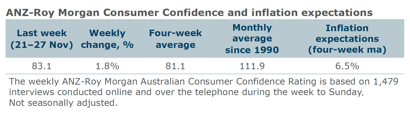 "Confidence is at its highest since early October but is still at exceptionally weak levels. The increase was mainly driven by the ‘financial situation compared to a year ago’ and ‘financial situation next year’ rising 9 per cent and 2.8 per cent respectively."Household inflation expectations dropped 0.1 percentage points to 6.2 per cent, its seventh straight week above 6 per cent. The drop in October retail sales suggests weak confidence may finally be impacting household spending. But changing seasonal patterns may explain some of the softness.