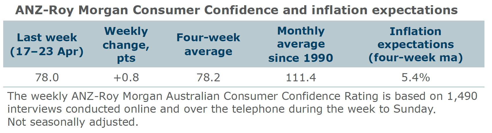 "Consumer confidence remained below 80 for the eighth week in a row," ANZ Senior Economist Adelaide Timbrell said. "This streak represents more weeks of confidence being below 80 than over the whole of 2020–22, revealing the effects of ongoing inflation and the adjustment to restrictive monetary policy.