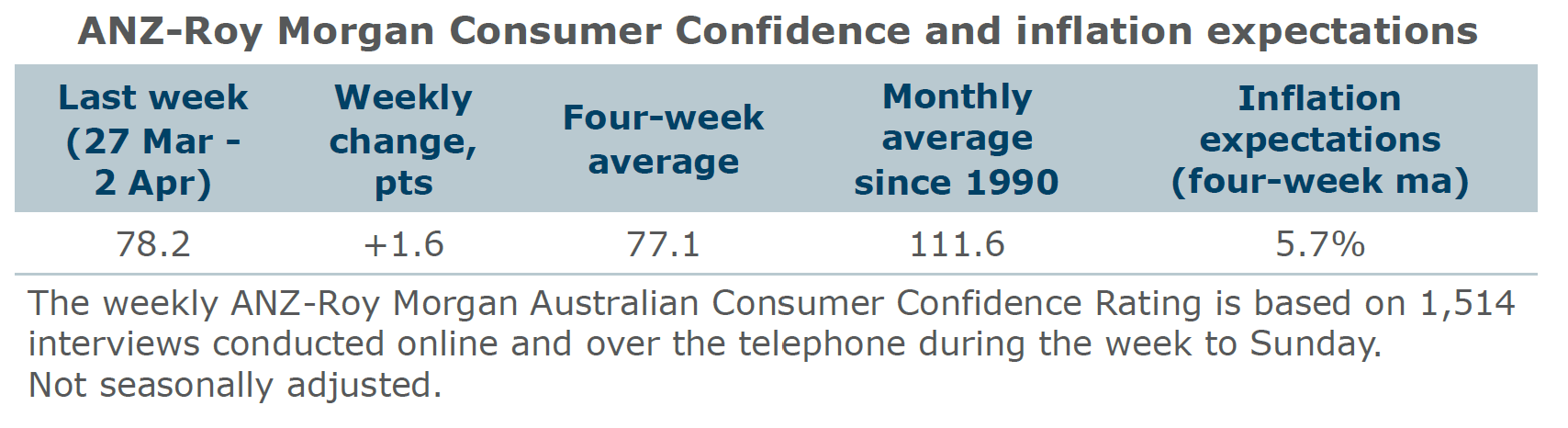 Consumer confidence increased by 1.6 points but remained below the 80 level for a fifth-straight week. Among the mainland states, confidence rose in New South Wales, South Australia and Western Australia, while it fell in Victoria and Queensland.