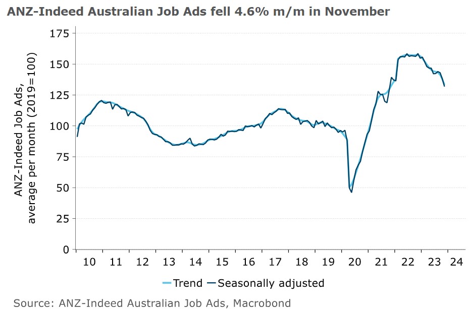 ANZ-Indeed Australian Job Ads fell 4.6% m/m in November following a downward revision in October to -3.4% m/m from -3.0% m/m. In trend terms, the series was down 3.4%m/m.