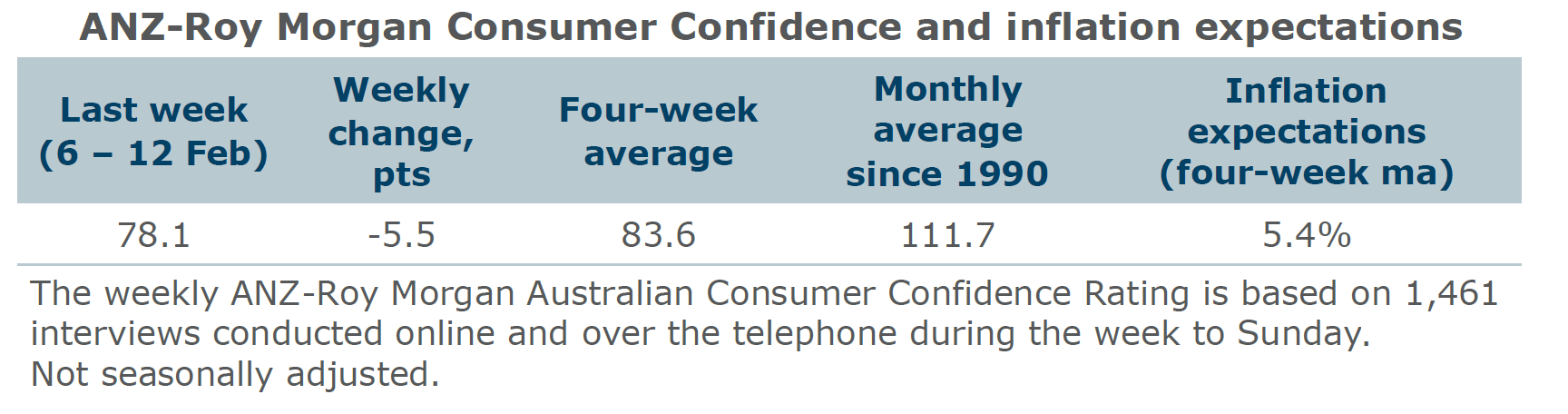 Consumer confidence dropped 5.5 points in the week to February 12, hitting 78.1 after a 3.2 point fall the week before. This is its lowest reading recorded since early April 2020. Confidence declined across all five mainland states for a second week in a row.