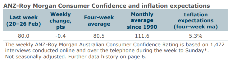Consumer confidence decreased slightly by 0.4pts last week to 80. Among the mainland states, confidence increased only in NSW, while it was lower in Victoria, Queensland, SA and WA.