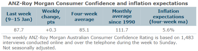 “Consumer confidence increased very slightly by 0.3 points to 87.7 in the second week of the year.,” ANZ Senior Economist Adelaide Timbrell said.