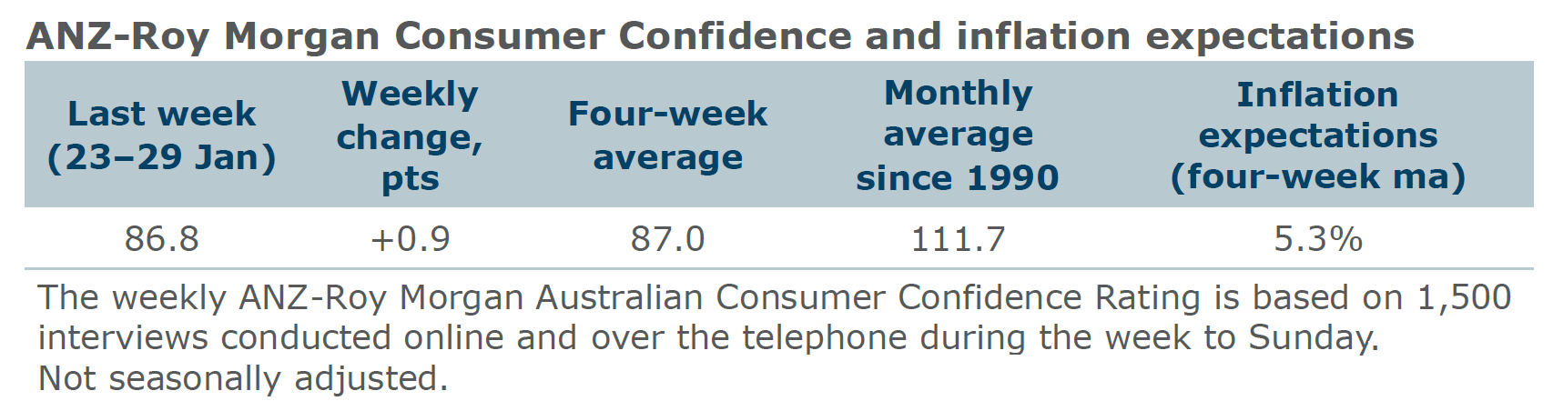 "Consumer confidence rose by 0.9 points to 86.8 last week," ANZ Senior Economist Adelaide Timbrell said. "After a jump at the start of the year, confidence has remained relatively stable over January, within a band of 1.8 points."