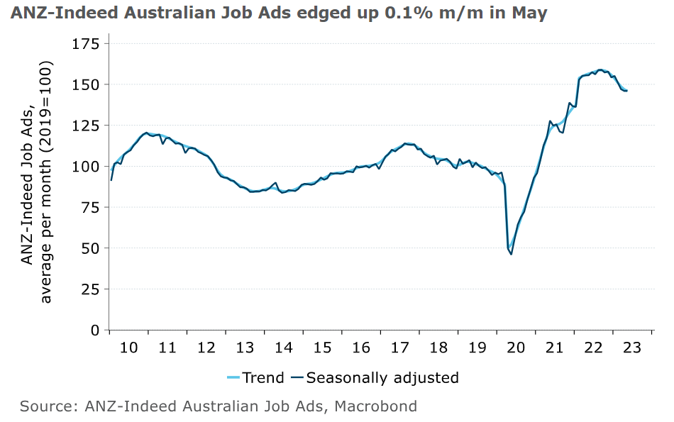ANZ-Indeed Australian Job Ads rose by 0.1% m/m in May following a downwardly revised 0.7% m/m fall in April. In trend terms, the series declined 0.7%m/m in May. ANZ-Indeed Job Ads remains 51.9% higher than pre-pandemic levels.