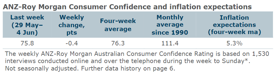 Consumer confidence decreased by 0.4pts. Among the mainland states, confidence rose in Victoria, Queensland and WA, but fell in NSW and SA.