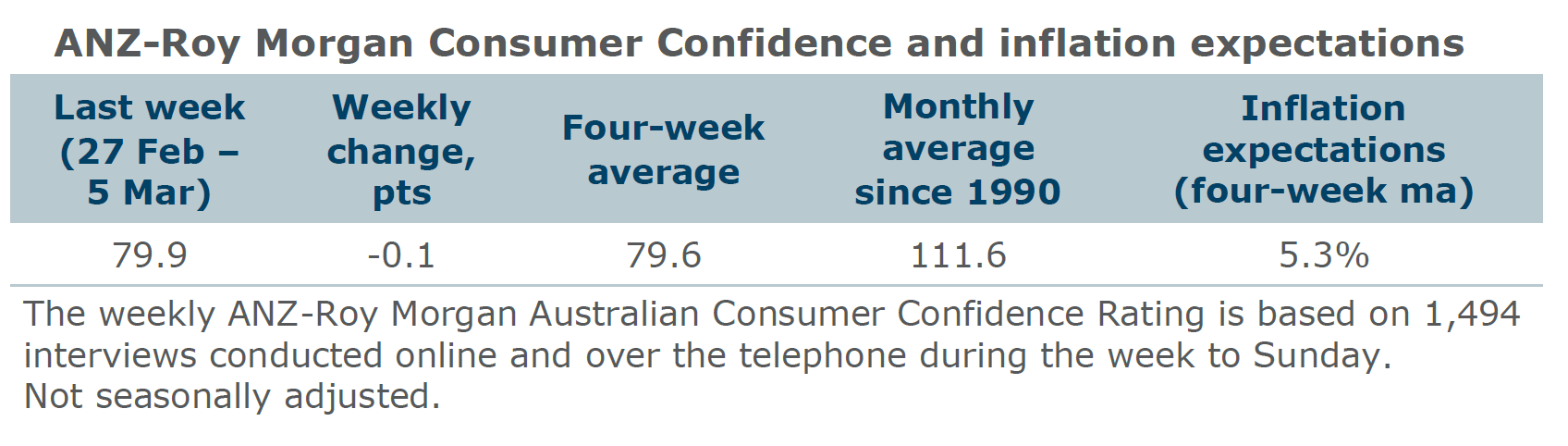 Consumer confidence decreased slightly by 0.1 points last week to 79.9. Among the mainland states, confidence increased in Queensland and South Australia, declined in New South Wales and Western Australia, and was unchanged in Victoria.