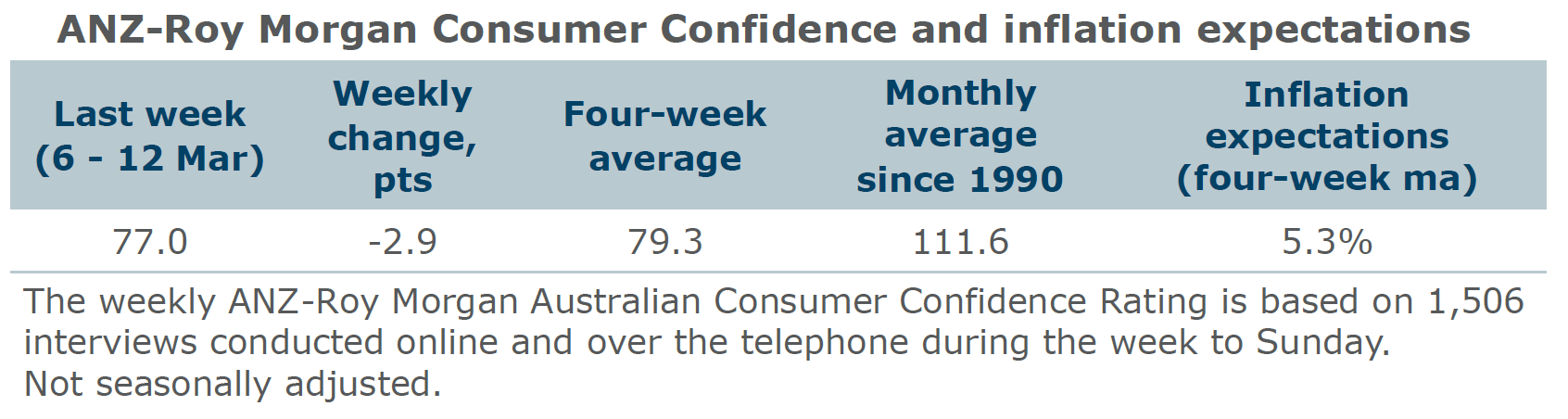 Consumer confidence dropped 2.9 points last week to 77.0, its weakest result since early April 2020. Confidence declined across all mainland states.