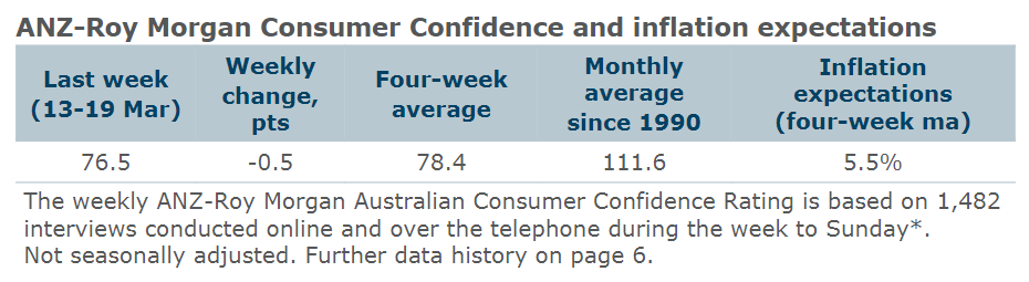 Consumer confidence decreased by 0.5pts last week to 76.5, its third consecutive week below 80. Among the mainland states, confidence rose in Victoria, SA, and WA, while it fell in NSW and Queensland.
