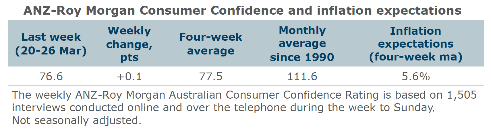 "Consumer confidence was practically unchanged last week and remained below the 80 level for a fourth consecutive week," ANZ Senior Economist Adelaide Timbrell said.