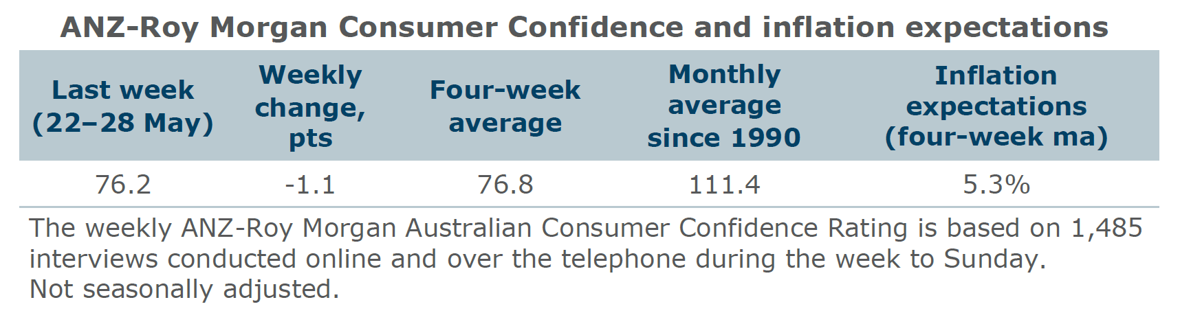 “Average confidence for May 2023 (76.8) was the weakest calendar-month average since December 1990, as cost-of-living pressure continues to impact households," ANZ Senior Economist Adelaide Timbrell said.
