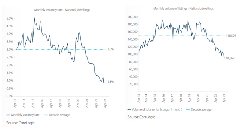 Rental vacancy rates as of April 2023 were 1.1 per cent nationally, below a decade average of 3 per cent. In the same period, total rent listings are 38.1 per cent below the previous decade average.