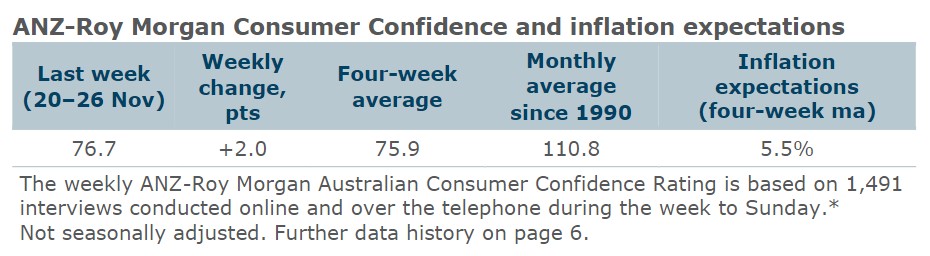ANZ Senior Economist, Adelaide Timbrell said: “The ANZ-Roy Morgan Australian Consumer Confidence index increased last week driven by a jump in the ‘time to buy a major household item’ subindex. The subindex climbed to its highest since the first week of February as buying sentiment remained upbeat over the week running into the Black Friday sales weekend.