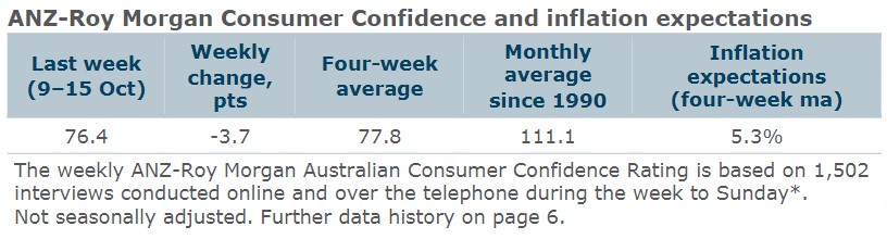 ANZ Senior Economist Adelaide Timbrell said: “The ANZ-Roy Morgan Australian Consumer Confidence index fell back below 80 after a 3.7pts decline last week. The weakness in confidence was broad-based, with declines across all subindices. Among the housing cohorts, confidence plunged for those paying off their homes (-7.2pts), reversing the gains of the previous two weeks. It fell for outright homeowners as well (-3pts), while it rose slightly for those renting (+1pt).