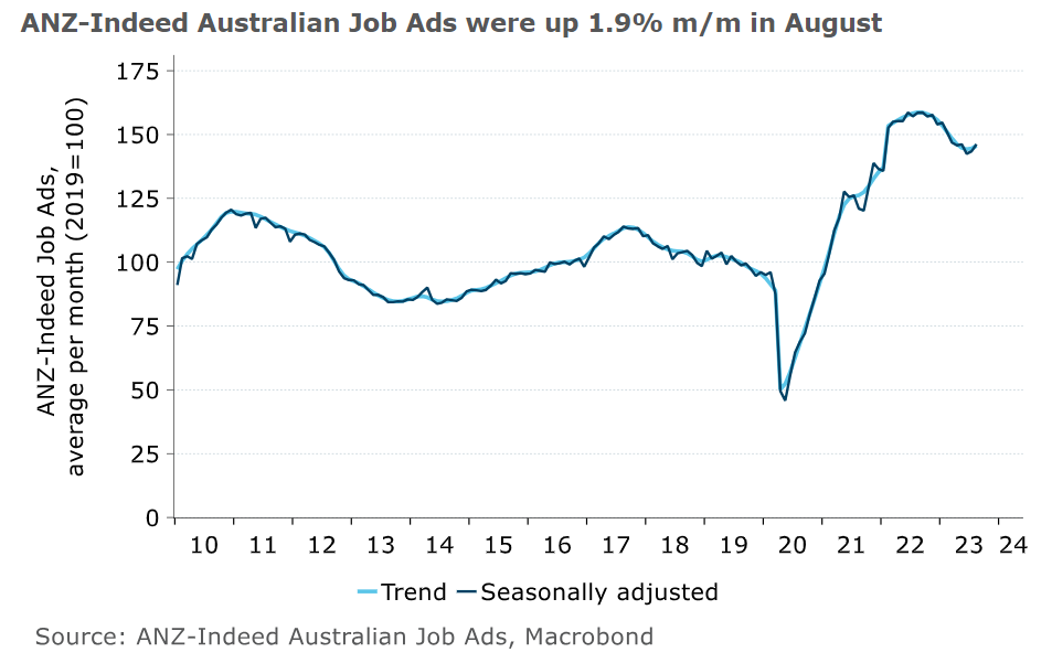In trend terms, the series is up 0.8% m/m in August. ANZ-Indeed Australian Job Ads have fallen 7.8% from the September 2022 peak but remain elevated compared to pre-COVID levels.
