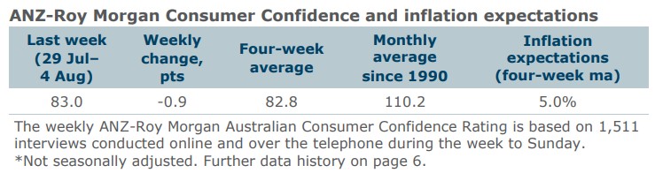 ANZ Economist, Madeline Dunk said: “ANZ-Roy Morgan Australian Consumer Confidence eased 0.9pts last week, driven by a 6.0pt fall in the ‘time to buy a major household item’ subindex. The current financial situation subindex also declined 1.9pts, but it is still up 5.2pts over the past two weeks and 9.6pts compared to the start of July. Despite some volatility in the week-to-week data, it appears the Stage 3 tax cuts are supporting confidence. Notably, inflation expectations fell to 4.7 per cent, their lowest level since January 2022, before inflation picked up materially in Australia.