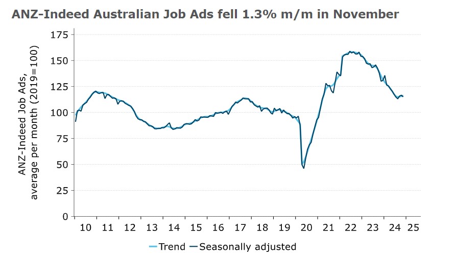 ANZ-Indeed Australian Job Ads fell 1.3 per cent month on month in November, following an upwardly revised 0.7 per cent month on month rise in October. In trend terms, the series was up 0.4 per cent month on month.