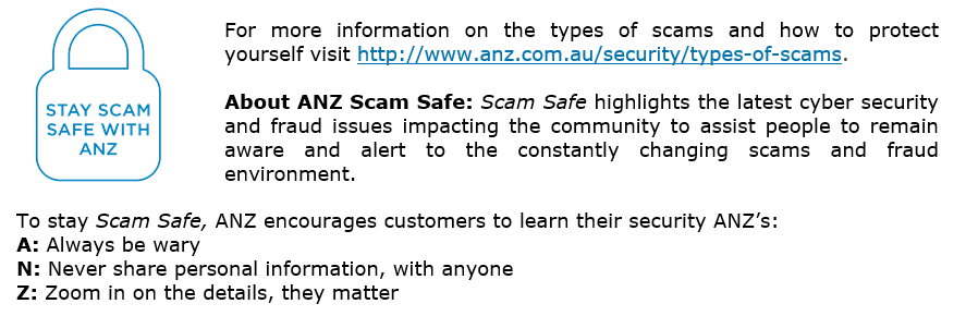 ANZ’s customer protection teams and systems operate 24/7. Customers who believe they may have been a victim of a scam should contact us immediately, on 13 33 50 or visit us at http://www.anz.com.au/security/report-fraud/ for more information.