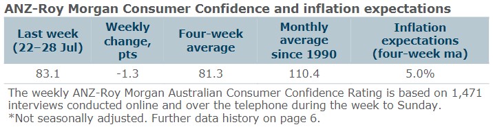 • Consumer confidence eased 1.3pts last week to 83.1pts but is still 4.6pts higher than a fortnight ago. The four-week moving average rose 0.4pts to 81.3pts.