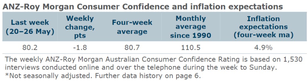ANZ Economist, Madeline Dunk said: “ANZ-Roy Morgan Australian Consumer Confidence was unable to hold onto the prior week’s gains, with the series falling 1.8pts last week. This takes the level of confidence back to a 2024 low of 80.2pts. While confidence is currently running modestly higher than the series’ 2023 average of 78.0pts, it is more than 30pts below the long-run average.