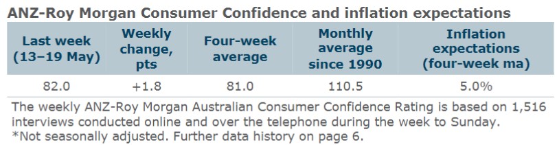 ANZ Economist, Madeline Dunk said: “ANZ-Roy Morgan Australian Consumer Confidence rose 1.8pts last week, but the series remains at very low levels. The lift was driven by a 3.9pt rise in confidence amongst renters. The boost could be linked to measures announced in the Budget such as the 10% rise in Commonwealth Rent Assistance.