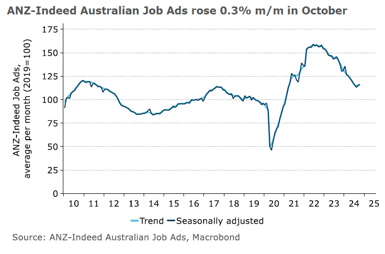 ANZ-Indeed Australian Job Ads rose 0.3 per cent month on month in October, following an upwardly revised 2.3 per cent month on month rise in September. In trend terms, the series was up 0.5 per cent month on month.