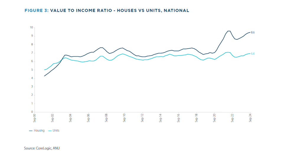 - Over the same period, the difference between the median house and unit value nationally increased from $46,000 to $207,000. As of September 2024, the portion of income required to service a mortgage on a median value house was 54.7%, and for units was a more manageable 41.6%.