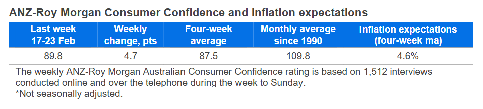 "ANZ-Roy Morgan Australian Consumer Confidence rose 4.7 points last week to 89.8 points, its highest level since May 2022," ANZ Economist, Sophia Angala said.