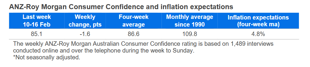 "ANZ-Roy Morgan Australian Consumer Confidence declined 1.6 points last week to 85.1 points, the lowest point in the year, so far. The four-week moving average has remained within the tight 86.0-86.9 points range since the beginning of January," ANZ Economist, Sophia Angala said.
